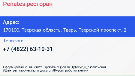 Penates, ресторан по адресу 170100, Тверская область, Тверь, Тверской проспект, 2 в дальнейшем Организация, размещена в следующих категориях: