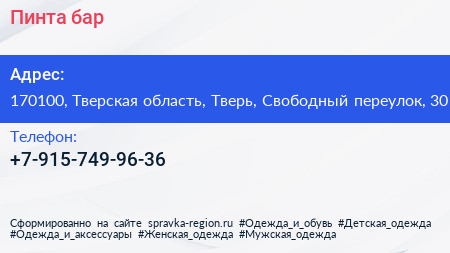 Пинта, бар по адресу 170100, Тверская область, Тверь, Свободный переулок, 30 в дальнейшем Организация, размещена в следующих категориях: