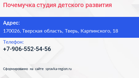 Почемучка, студия детского развития по адресу 170026, Тверская область, Тверь, Карпинского, 18 в дальнейшем Организация, размещена в следующих категориях:
