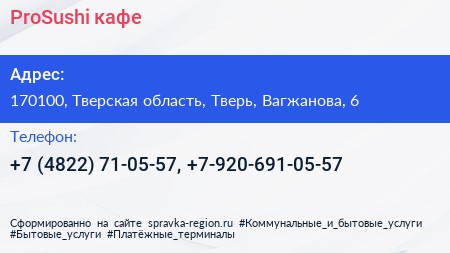ProSushi, кафе по адресу 170100, Тверская область, Тверь, Вагжанова, 6 в дальнейшем Организация, размещена в следующих категориях: