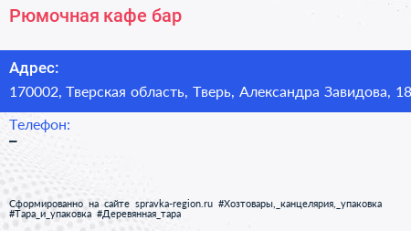 Рюмочная, кафе-бар по адресу 170002, Тверская область, Тверь, Александра Завидова, 18 в дальнейшем Организация, размещена в следующих категориях:
