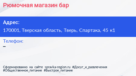 Рюмочная, магазин-бар по адресу 170001, Тверская область, Тверь, Спартака, 45 к1 в дальнейшем Организация, размещена в следующих категориях: