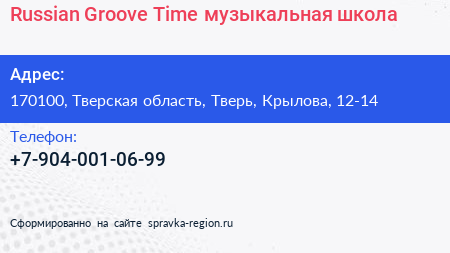 Russian Groove Time, музыкальная школа по адресу 170100, Тверская область, Тверь, Крылова, 12-14 в дальнейшем Организация, размещена в следующих категориях: