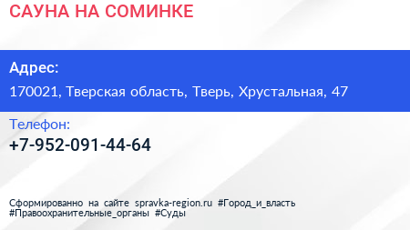 САУНА НА СОМИНКЕ по адресу 170021, Тверская область, Тверь, Хрустальная, 47 в дальнейшем Организация, размещена в следующих категориях: