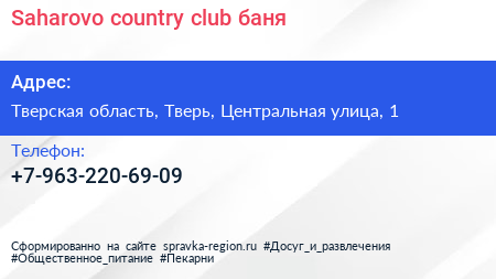 Saharovo country club, баня по адресу Тверская область, Тверь, Центральная улица, 1 в дальнейшем Организация, размещена в следующих категориях: