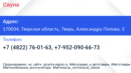 Сауна по адресу 170034, Тверская область, Тверь, Александра Попова, 3 в дальнейшем Организация, размещена в следующих категориях: