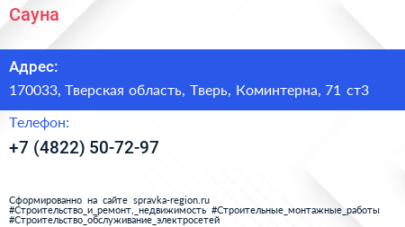 Сауна по адресу 170033, Тверская область, Тверь, Коминтерна, 71 ст3 в дальнейшем Организация, размещена в следующих категориях: