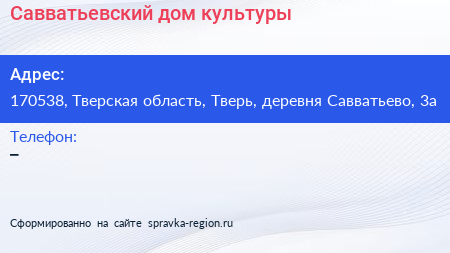 Савватьевский дом культуры по адресу 170538, Тверская область, Тверь, деревня Савватьево, 3а в дальнейшем Организация, размещена в следующих категориях: