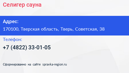 Селигер, сауна по адресу 170100, Тверская область, Тверь, Советская, 38 в дальнейшем Организация, размещена в следующих категориях: