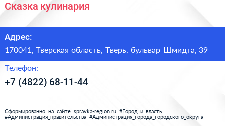 Сказка, кулинария по адресу 170041, Тверская область, Тверь, бульвар Шмидта, 39 в дальнейшем Организация, размещена в следующих категориях: