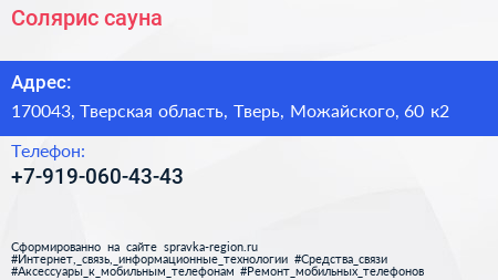 Солярис, сауна по адресу 170043, Тверская область, Тверь, Можайского, 60 к2 в дальнейшем Организация, размещена в следующих категориях: