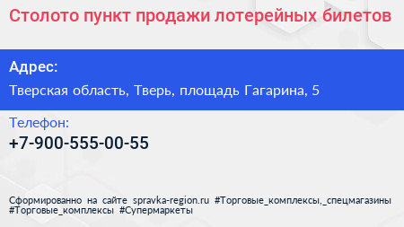 Столото, пункт продажи лотерейных билетов по адресу Тверская область, Тверь, площадь Гагарина, 5 в дальнейшем Организация, размещена в следующих категориях: