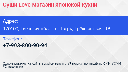 Суши Love, магазин японской кухни по адресу 170100, Тверская область, Тверь, Трёхсвятская, 19 в дальнейшем Организация, размещена в следующих категориях: