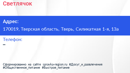 Светлячок по адресу 170019, Тверская область, Тверь, Силикатная 1-я, 13а в дальнейшем Организация, размещена в следующих категориях: