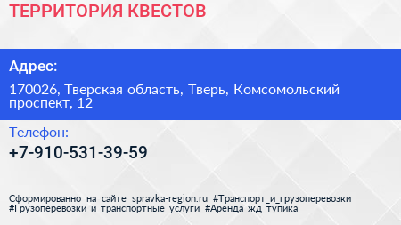 ТЕРРИТОРИЯ КВЕСТОВ по адресу 170026, Тверская область, Тверь, Комсомольский проспект, 12 в дальнейшем Организация, размещена в следующих категориях:
