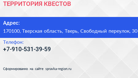 ТЕРРИТОРИЯ КВЕСТОВ по адресу 170100, Тверская область, Тверь, Свободный переулок, 30 в дальнейшем Организация, размещена в следующих категориях:
