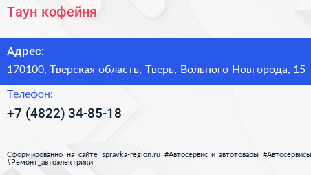 Таун, кофейня по адресу 170100, Тверская область, Тверь, Вольного Новгорода, 15 в дальнейшем Организация, размещена в следующих категориях: