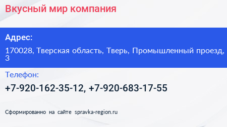 Вкусный мир, компания по адресу 170028, Тверская область, Тверь, Промышленный проезд, 3 в дальнейшем Организация, размещена в следующих категориях: