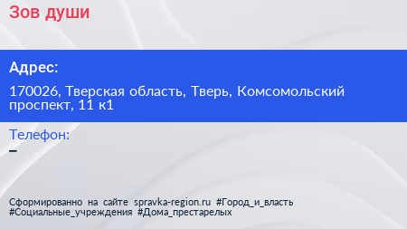 Зов души по адресу 170026, Тверская область, Тверь, Комсомольский проспект, 11 к1 в дальнейшем Организация, размещена в следующих категориях: