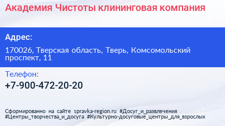 Академия Чистоты, клининговая компания по адресу 170026, Тверская область, Тверь, Комсомольский проспект, 11 в дальнейшем Организация, размещена в следующих категориях: