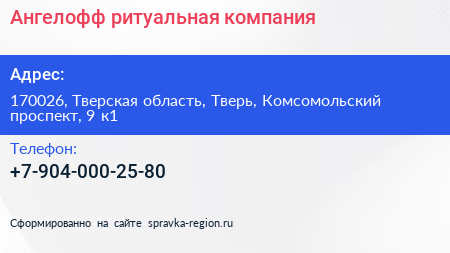 Ангелофф, ритуальная компания по адресу 170026, Тверская область, Тверь, Комсомольский проспект, 9 к1 в дальнейшем Организация, размещена в следующих категориях: