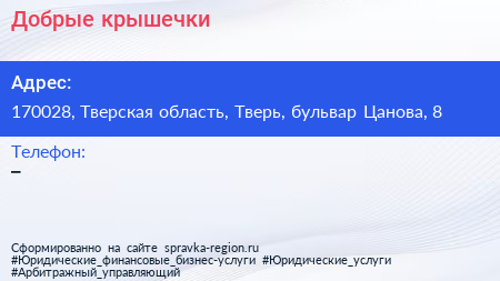 Добрые крышечки по адресу 170028, Тверская область, Тверь, бульвар Цанова, 8 в дальнейшем Организация, размещена в следующих категориях: