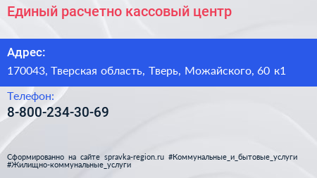 Единый расчетно-кассовый центр по адресу 170043, Тверская область, Тверь, Можайского, 60 к1 в дальнейшем Организация, размещена в следующих категориях: