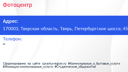 Фотоцентр по адресу 170003, Тверская область, Тверь, Петербургское шоссе, 45 в дальнейшем Организация, размещена в следующих категориях: