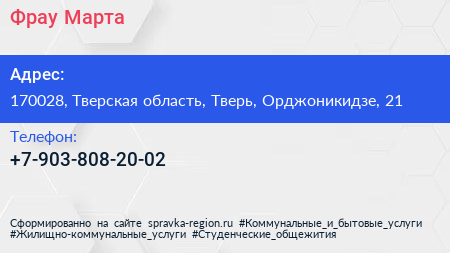 Фрау Марта по адресу 170028, Тверская область, Тверь, Орджоникидзе, 21 в дальнейшем Организация, размещена в следующих категориях: