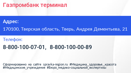 Газпромбанк, терминал по адресу 170100, Тверская область, Тверь, Андрея Дементьева, 21 в дальнейшем Организация, размещена в следующих категориях: