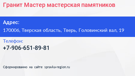 Гранит-Мастер, мастерская памятников по адресу 170006, Тверская область, Тверь, Головинский вал, 19 в дальнейшем Организация, размещена в следующих категориях:
