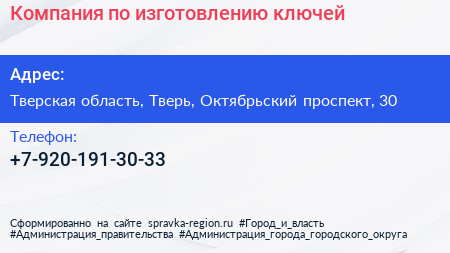 Компания по изготовлению ключей по адресу Тверская область, Тверь, Октябрьский проспект, 30 в дальнейшем Организация, размещена в следующих категориях: