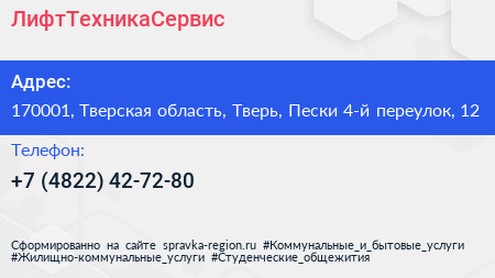 ЛифтТехникаСервис по адресу 170001, Тверская область, Тверь, Пески 4-й переулок, 12 в дальнейшем Организация, размещена в следующих категориях: