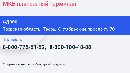МКБ, платежный терминал по адресу Тверская область, Тверь, Октябрьский проспект, 70 в дальнейшем Организация, размещена в следующих категориях:
