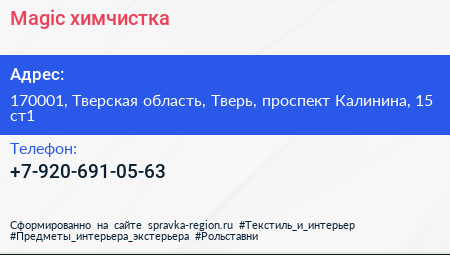 Magic, химчистка по адресу 170001, Тверская область, Тверь, проспект Калинина, 15 ст1 в дальнейшем Организация, размещена в следующих категориях: