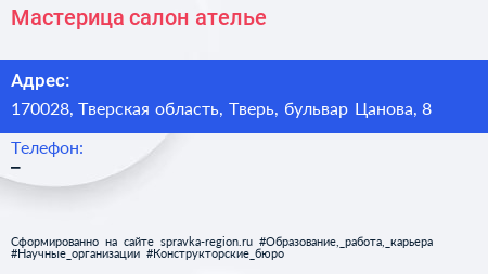 Мастерица, салон-ателье по адресу 170028, Тверская область, Тверь, бульвар Цанова, 8 в дальнейшем Организация, размещена в следующих категориях: