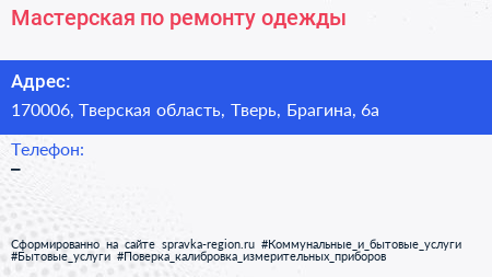 Мастерская по ремонту одежды по адресу 170006, Тверская область, Тверь, Брагина, 6а в дальнейшем Организация, размещена в следующих категориях: