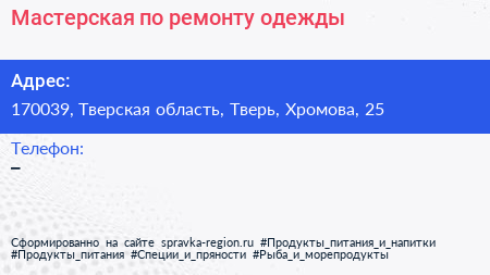 Мастерская по ремонту одежды по адресу 170039, Тверская область, Тверь, Хромова, 25 в дальнейшем Организация, размещена в следующих категориях: