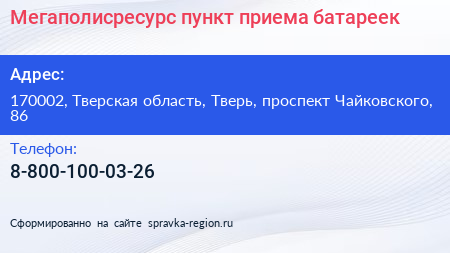 Мегаполисресурс, пункт приема батареек по адресу 170002, Тверская область, Тверь, проспект Чайковского, 86 в дальнейшем Организация, размещена в следующих категориях: