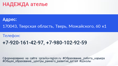 НАДЕЖДА, ателье по адресу 170043, Тверская область, Тверь, Можайского, 60 к1 в дальнейшем Организация, размещена в следующих категориях: