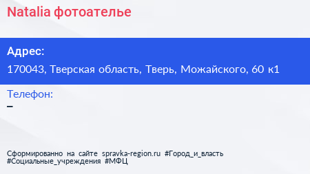 Natalia, фотоателье по адресу 170043, Тверская область, Тверь, Можайского, 60 к1 в дальнейшем Организация, размещена в следующих категориях: