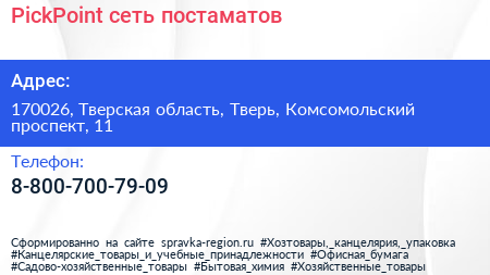 PickPoint, сеть постаматов по адресу 170026, Тверская область, Тверь, Комсомольский проспект, 11 в дальнейшем Организация, размещена в следующих категориях: