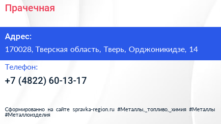 Прачечная по адресу 170028, Тверская область, Тверь, Орджоникидзе, 14 в дальнейшем Организация, размещена в следующих категориях: