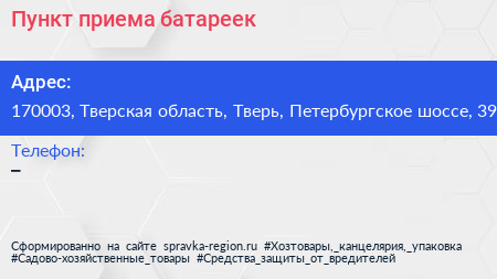 Пункт приема батареек по адресу 170003, Тверская область, Тверь, Петербургское шоссе, 39 в дальнейшем Организация, размещена в следующих категориях: