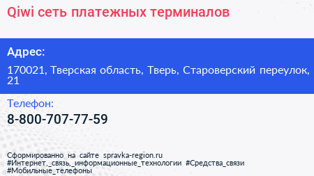 Qiwi, сеть платежных терминалов по адресу 170021, Тверская область, Тверь, Староверский переулок, 21 в дальнейшем Организация, размещена в следующих категориях: