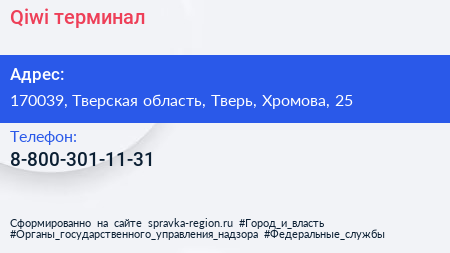 Qiwi, терминал по адресу 170039, Тверская область, Тверь, Хромова, 25 в дальнейшем Организация, размещена в следующих категориях: