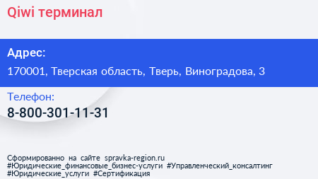 Qiwi, терминал по адресу 170001, Тверская область, Тверь, Виноградова, 3 в дальнейшем Организация, размещена в следующих категориях: