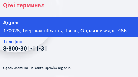 Qiwi, терминал по адресу 170028, Тверская область, Тверь, Орджоникидзе, 48Б в дальнейшем Организация, размещена в следующих категориях: