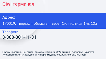 Qiwi, терминал по адресу 170019, Тверская область, Тверь, Силикатная 1-я, 13а в дальнейшем Организация, размещена в следующих категориях: