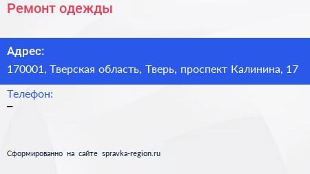 Ремонт одежды по адресу 170001, Тверская область, Тверь, проспект Калинина, 17 в дальнейшем Организация, размещена в следующих категориях: